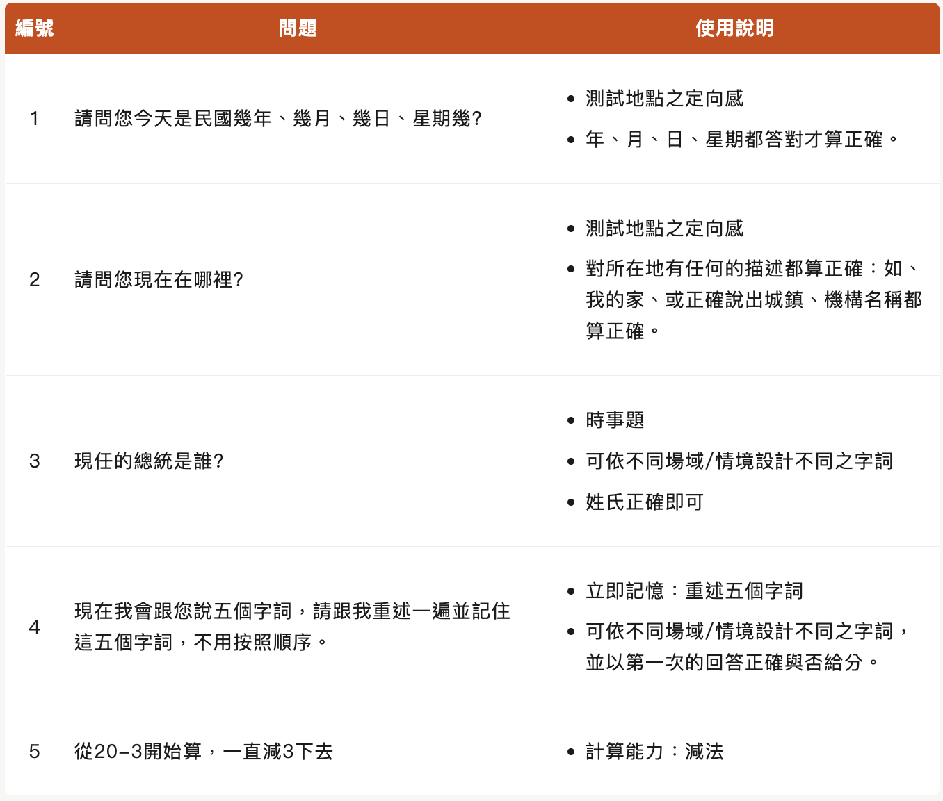 如果擔心周遭親友可能有疑似失智情形,可利用失智症簡易辨識問卷,在問項中任選3題,如果有2題無法回答,建議可到醫療院所進一步檢查。