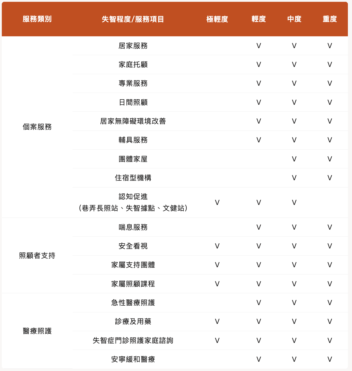 確診失智症後,可向各縣市長期照顧管理中心提出申請長照服務,會由長期照顧管理專員評估,如符合長照需要等級第2級以上者,依照顧需要提供照顧及專業服務、交通接送、喘息服務、輔具租借購買及居家無障礙環境改善等四大長照服務。
